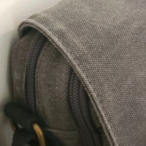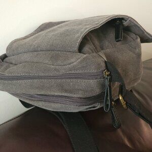 Hardy utility style cargo bag made from canvas. Features 2 deep zippered pockets, 1 front zip pocket for easy access, and an enclosed front pocket. Excellent for traveling or back packing. From a pet free, smoke free home.