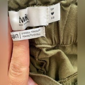 Cargo shorts, worn once Lyocell Coton blend, very comfortable Stretchy waist, zip fly, decorative tie at the waist Big pockets in the front Comes from a smoke-free house