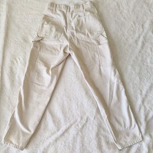 Cargo style pants, structured fit, high rise waist, straight leg bottoms, functional pockets on sides and on thighs and back