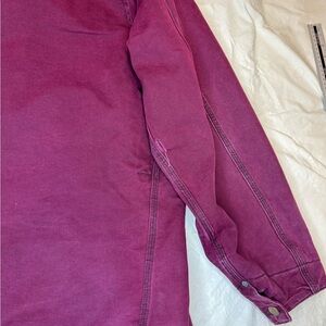 Stylish Carhartt work jacket in a rich burgundy color. Features multiple pockets and button closure. Beautiful jacket does have hole in arm and does not have size tag probably L but fits XL