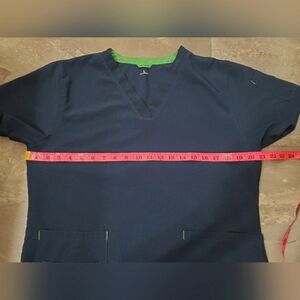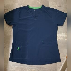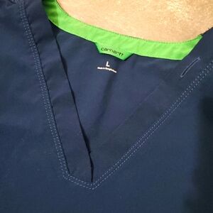 Carhartt Force Scrub Fitted Top. Dark Blue with Green Accents. Size L, see pictures for measurements. Front pockets. Excellent condition. No stain, no rip. Non smoking house.