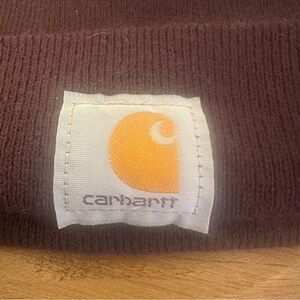 Carhartt dark brown beanie toque hat. Adult one size. In good used condition with no holes or staining. Classic hat with the Carhartt logo on the front of the folding trim. Style A18 V26.