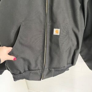 Stylish Carhartt jacket with a hood. Features a front zipper and pockets.