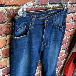 These men's work jeans have all the durability you'd expect from a pair of Carhartt pants but with extra flexibility too. The heavyweight denim has some stretch giving you easy movement on the job. They're cut with a boot cut leg and a relaxed fit with extra room in the seat and thigh. 12-ounce, 85% cotton / 14% polyester / 1% spandex denim. Built to move with Rugged Flex® stretch technology. Relaxed Fit: Comfortable fit through the seat and thigh with more room to move and a straight leg opening. Strong sewn-on-seam belt loops. Front and back pockets