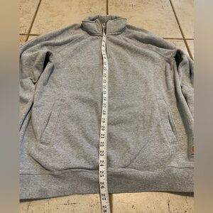 This is a comfortable and durable Carhartt pullover sweatshirt, perfect for cooler weather or layering. It's a men's size M with a relaxed fit for easy movement. The sweatshirt is a versatile heather gray color and features a 1/4 zip collar and a front kangaroo pocket. It's made in Mexico and is in great pre-owned condition with no noticeable flaws.