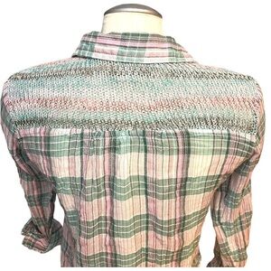 Caribbean Joe Lightweight Plaid Button Up Top with Roll Tab Sleeves