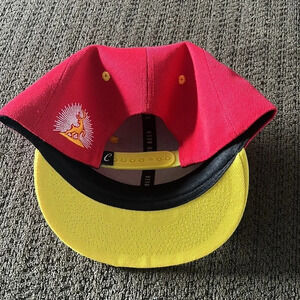 This is a vibrant red and yellow snapback cap featuring the Cariboo Beer logo. It has a structured design with a flat brim and adjustable snapback closure.