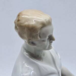 A porcelain statue of a man; it looks like perhaps he is spreading seeds from a sack around his waist. It was made by Carl Scheidig in Grafenthal, Germany somewhere between 1972 and 1990 based on its mark, a crown. The mold for the statue was originally used by another company in the region, Wagner & Apel which Scheidig used the crown mark to indicate.