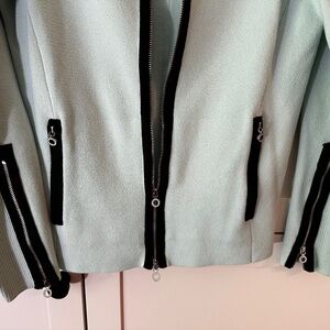 Pale aqua with striking black contrasting trim stripes and zipper detailing. Lightly worn and in good pre-owned condition.