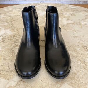 In excellent preowned condition, these look like new, gorgeous faux leather harness ankle booties from Carlos Santana. Classic styling with a touch of edginess, these comfortable ankle boots feature a size zipper, beautiful almond toe and a 1.5” heel.