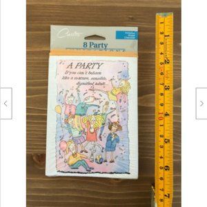 Vintage unopened invitation cards by Carlton Cards read "A Party: If you can't behave like a mature, sensible, dignified adult..." on the front with inner text "...this is the party for you!" Package of 8 invitation cards with envelopes. Cards are approx. 4" x 5".