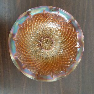 A beauiful piece in very good condition. No visable chips or cracks It is an orange leaning marigold with iridescence that shifts from orange to pink to blue to purple. Vintage from the 1940s Width: 11 inches Height: 3 inches