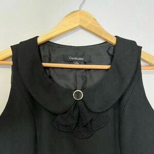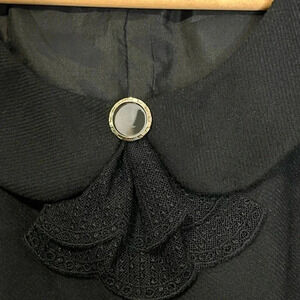 Like new condition. Rounded fold down collar. Broach with lace accent on collar. Front functional pockets with flaps. Lined. Hidden side zipper. Has a Wednesday Adams vibe to it.