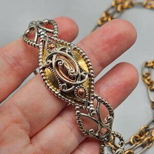 Carolyn Pollack necklace, bracelet and pendant set. Made of 925 sterling silver, brass and copper. Pendant is a pretty elongated teardrop shape with beautiful filigree. Bracelet middle part is rigid, bracelet is about 7" long. Necklace 35", pendant about 2.5" long. All pieces in excellent condition.