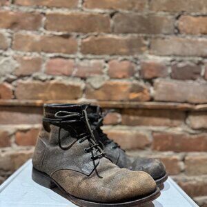 Ultra-rare archival Carpe Diem boots, hand-crafted in Italy from thick, durable reverse horse leather with a beautifully aged and distressed patina. These iconic lace-up combat boots feature a rugged leather sole reinforced with iron nails – a signature of Carpe Diem's artisanal, pre-Artisanal movement craftsmanship.