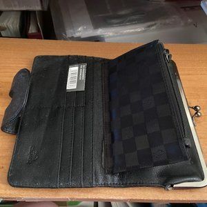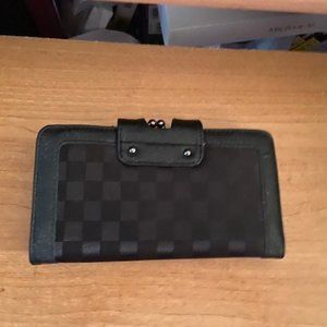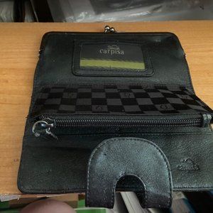 Carpisa wallet new with tags, purchased in Italy. Wallet is 40% polyester, 60% polyurethane. Zipper compartment for coins, credit card slots, snap closure on front. Elegant and timeless, this Italian-designed wallet features a classic black checkerboard pattern, giving it a touch of subtle sophistication. Its compact structure is accentuated by a distinctive silver-toned clasp that not only adds an element of chic but also ensures your valuables stay secure. This wallet offers the perfect blend of functionality and style, making it an ideal accessory for the fashion-conscious individual. Has some slight wear on closure see last picture. Colour depends on screen settings and lighting in pictures. All measurements are approximate and are taken with item laying flat and unstretched. All items are from my smoke free home.