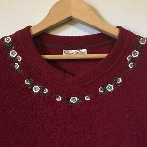 Good preowned vintage condition, red, fleece, crew neck with sweet floral embroidery by Carroll Reed. Warm, cosy and perfect for sitting around the fire at camp telling stories.