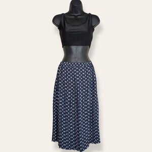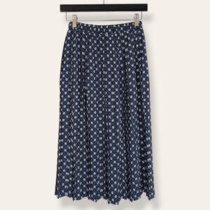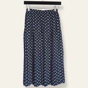 This dark vintage skirt by Carroll Reed, is a beautiful navy with small white snowflakes. It is pleated with an elastic waist and has its labels.