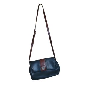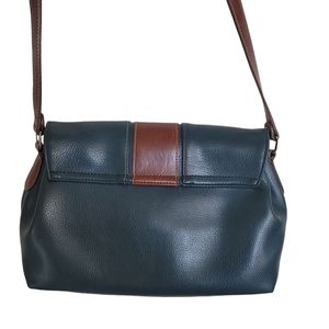 Carryland USA dark teal and brown leather wit silver-toned accents flap closure with magnetic snap three interior compartments adjustable strap