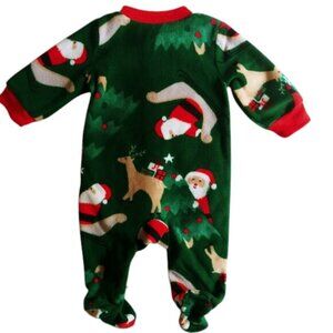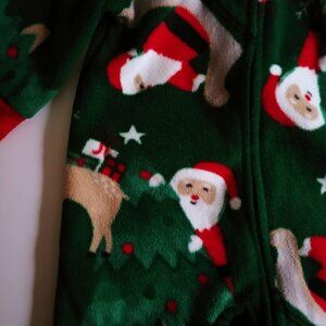 Carter's vibrant green 2-Way zip-up footie featuring a playful Christmas print of Santa Claus, reindeer, and Christmas trees. Red rib-knit cuffs and collar add a festive contrast, while the 2-way front zipper makes dressing and diaper changes a breeze. Soft fleece and cozy it’s perfect for winter nights, holiday photos, or seasonal celebrations. Very good condition no stains or holes.