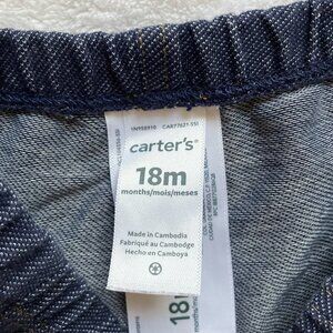Toddler denim-look pants from Carter's in size 18 months. 72% cotton, 26% polyester, 2% elastane. Blue wash with an elastic waist.