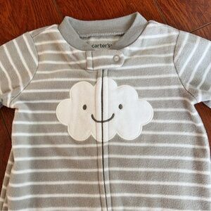 Soft and cozy Carter’s baby sleeper featuring a cute smiling cloud patch on the front and classic grey-and-white stripes. Made from warm fleece fabric, perfect for cooler days and nights.