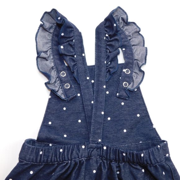 This beautiful Carter's Baby Girl 18 months Blue Denim look Chambray with white polka dots overall dress is in excellent clean condition. Dress is 57% Cotton, 36% Polyester and 7% Elastane - Machine washable. Straps feature 2 snap buttons for adjustment.