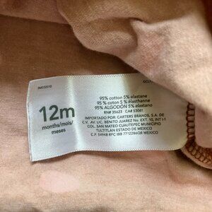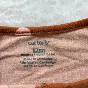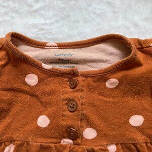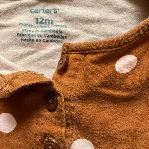 Carter’s baby girl long sleeve top in size 12 months. 95% cotton, 5% elastane. Warm brown base with soft pink polka dots, button detail at the front, and subtle ruffle trim at the shoulders.