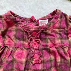Carter’s baby girl plaid top, size 12 months. 100% cotton. Pink and olive plaid pattern. Long sleeves with elastic cuffs and button-front detail with ruffle trim.