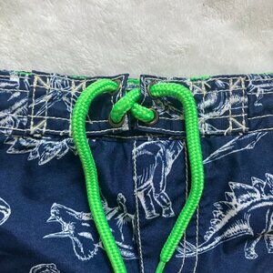 Carter’s baby swim trunks in size 18 months. 100% polyester. Navy blue with all-over dinosaur skeleton print and neon green drawstring. Functional pocket with Velcro closure and elastic waist.