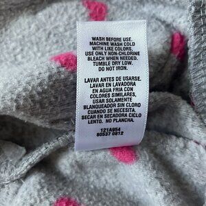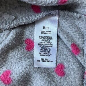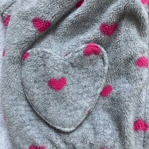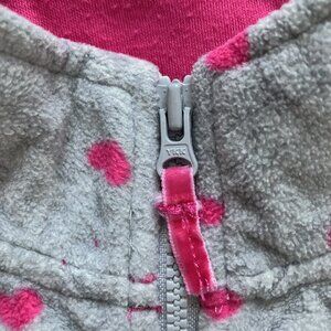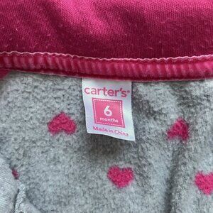 Baby fleece vest by Carter’s, size 6 months. Light grey with pink heart print, gathered front, and sweet heart-shaped pockets. Ribbed hem and cozy fleece fabric make it perfect for layering on cool days.