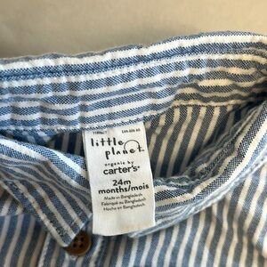 Adorable Carter's romper with blue and white stripes. Features button accents and a soft collar.
