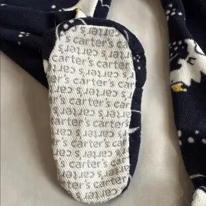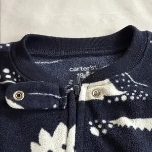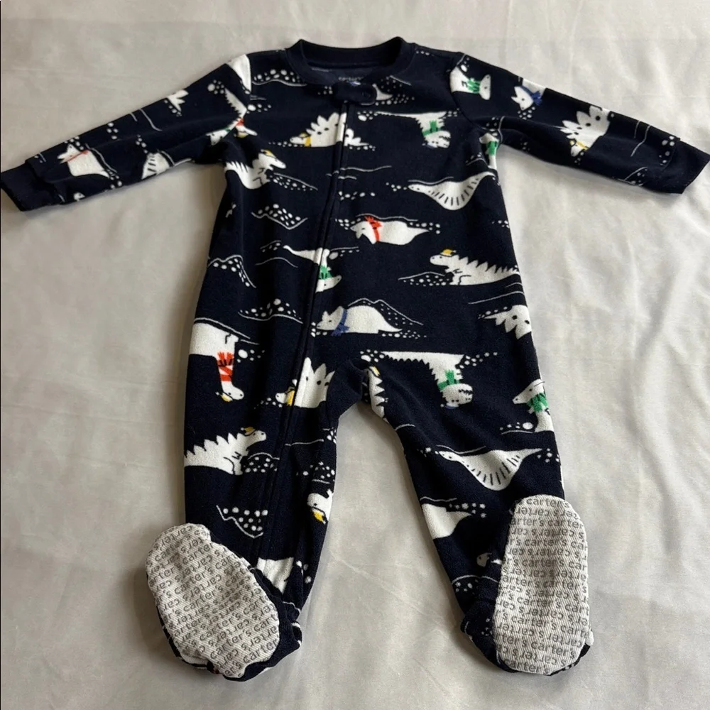 Carter's toddler boys navy blue one piece fleece pajama with grip feet, features a playful dinosaur print This 1-piece takes him from playtime to bedtime in no time! Zip-up design -- from ankle to chin -- makes for quick changes and easy dressing. Perfect for your little one's adventures. Super soft, cozy, comfortable and warm, it's ideal for everyday wear. Winter, fall, cozy, warm.