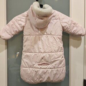 In like new condition, this is a Carter's pale pink bunting with silver stars and fluffy white trim around the hood. Size is 0-6 months. Fibers are polyester and acrylic and it it machine washable and dryable.