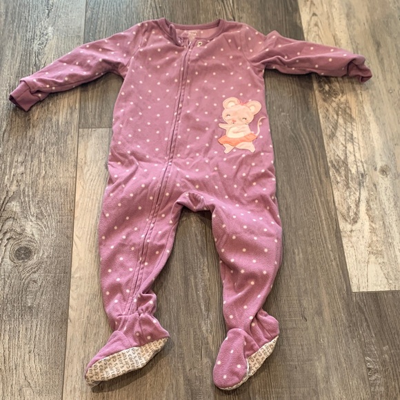 Adorable purple one piece with playful polka dots and a cute mouse design. Perfect for keeping your little one cozy and stylish.