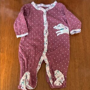 Adorable red one piece with white polka dots and a cute reindeer design. Perfect for keeping your little one cozy and stylish.