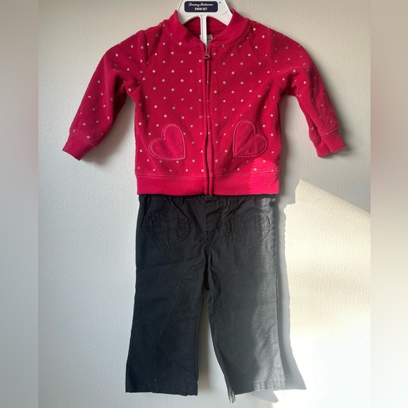 Red zip-up jacket with heart pockets. Black pants with heart details.