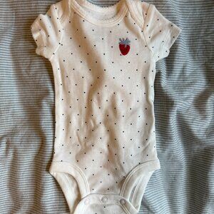 Polka dot short sleeved onesie with matching navy blue strawberry shirt
