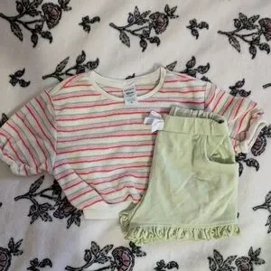 Two-piece set with a cream tee featuring pink and coral stripes. Paired with light green shorts with ruffle hem and elastic waist from Mexx. In excellent condition.
