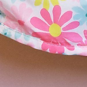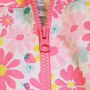 Carter's Toddler Size 3T Windbreaker - Gently Used. The zipper and some of the flowers are hot pink. There is light pinkm blue and yellow flowers. Really a cute little jacket. Really girlie :) The jacket has two front pockets. There is a hood and cannot be removed. The sleeves are 10.75in long. Rhe height onf the jacket is 17.5in. Armpit to armpit is 12.5in.