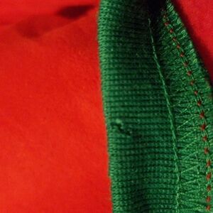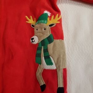 NWT Carter's red blanket sleeper 12 months, reindeer design, zipper up with tab that goes over the zipper, has a small defect in the ribbing on the inside of the neck, anti slip bottoms on the feet