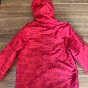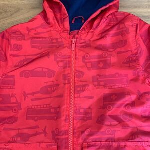 Carters kids jacket in red with vehicle images. Fleece lined for cozy comfort, weather resistant, hood, full zip closure, large patch pockets. Excellent used condition with no stains, damage or wear detected. Sz 7 for boy or girl. Perfect for spring, fall, outdoor adventures. From Lemon Squeezy Shop🍋