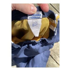 Size 18-24 months on tag. 100% polyester. Wide leg. Stretch waistband with two accessory waist side snaps. Two pockets. Mesh lined. Play condition due to left knee pinholes in 2nd last photo and pilling/wear to mesh lining inside leg cuffs. No stains noted.