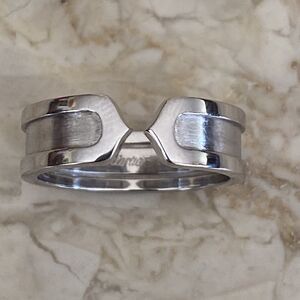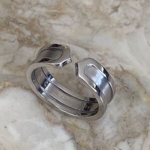 Authentic C de Cartier 18K white gold ring. Stunning, elegant, timeless and iconic unisex piece! Beautiful high polish edges with brushed finish centre. About 6.5mm wide. All authenticity markers are there, comes with the original Cartier ring box and storage box.