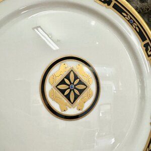 White/ivory porcelain service plate. Gold and black pattern. Cartier signature print at back. Come as is.
