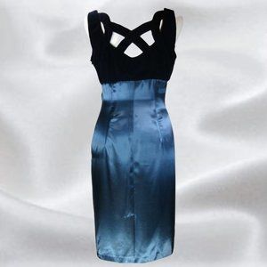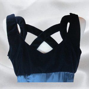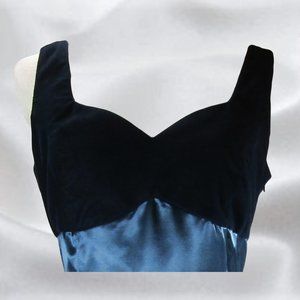 A made in Canada dress by Cartise International in size 12. This striking bluish green dress is sleeveless has a flattering sweatheart neckline, velvety top and detailed criss cross back. This dress is in excellent pre-owned condition with no flaws. Great to wear for any special occasion. Measurements in photos - note measurements taken flat and unstretched. Waist, Hip and armpit to armpit (chest) is then doubled.