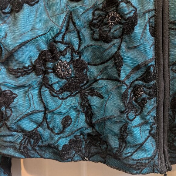 - green with black flower lace overlay. Stretch fabric, zip up front