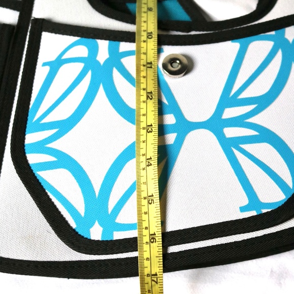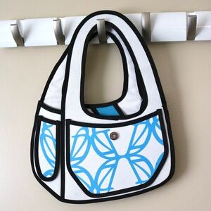 Fun 2D (flat) purse/handbag by Ruyhuang in blue and white. Purse features dome closure and main compartment does open up and is room for essentials plus a bit more! Small zippered compartment on back of bag and tiny side pocket on outside. Make a statement with this cartoon-like bag! Pre-owned but in excellent condition. Smoke-free, pet friendly home!
