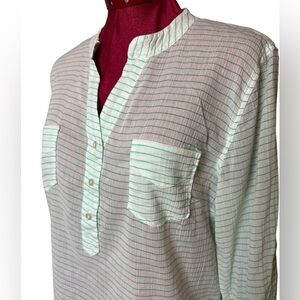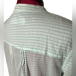 Lightweight, sheer breathable crinkle organic cotton with adjustable sleeve length. The crinkle gives this a little stretch for comfort even though it’s not a knit. Features two front patch pockets, pearlescent buttons and bust darts for shaping a nice silhouette. Beautifully finished throughout with a double fold hem. Like new condition. PTP: 20 - 21.5” Back length from neck: 26” Sleeve length: 22.25” including the 2.25” cuff; about 13” when folded up