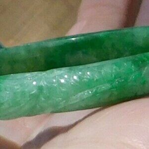Carved Jade / Jadeite? Bangle Bracelet Green Marbled Size: 2.25" Inside Across "COLD"